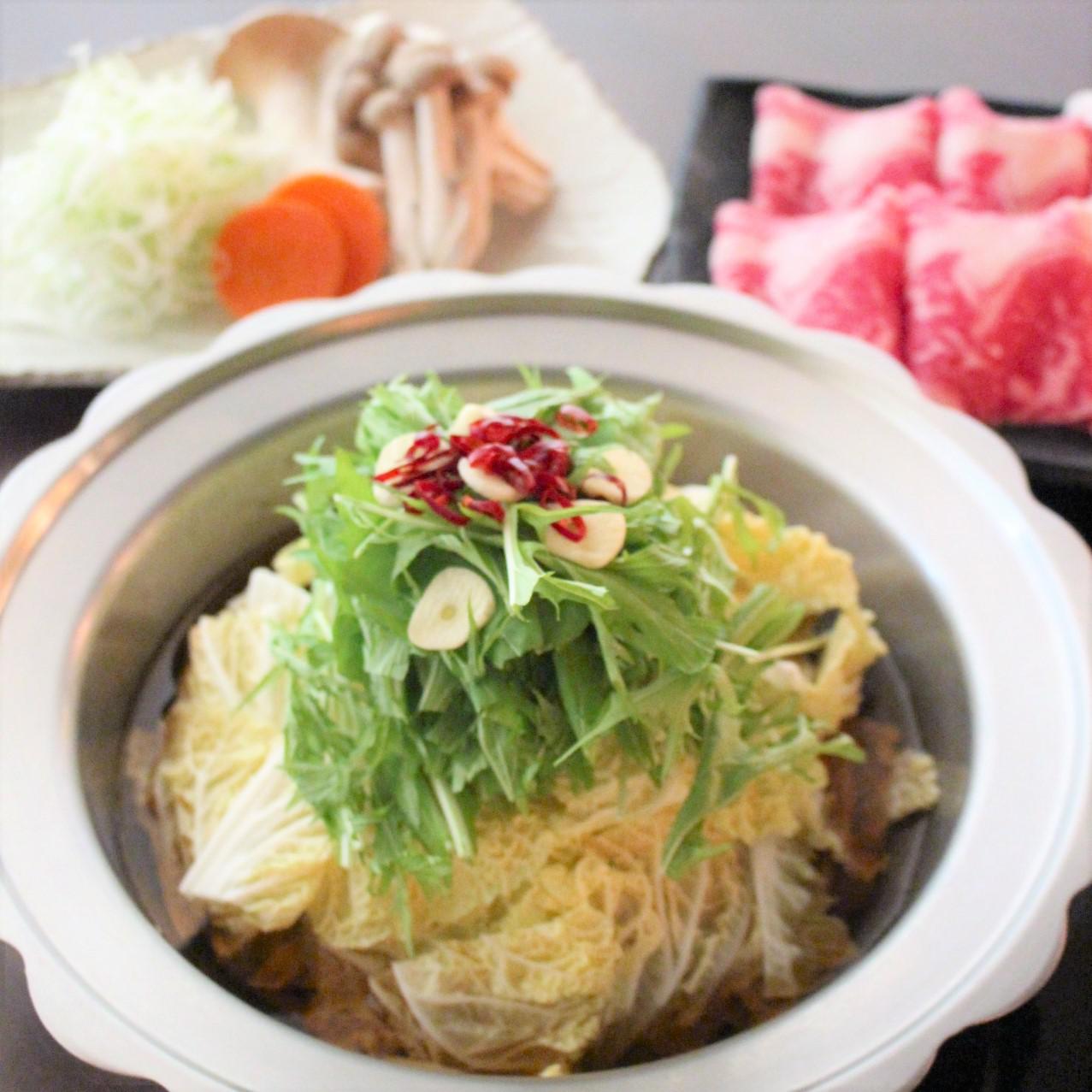 すき焼き風の甘辛い割り下がベースのスープでふわっとお肉をしゃぶしゃぶ。